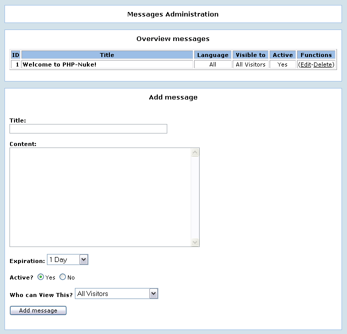 module. A message is an Administration Message that appears above all news articles in the Home Page.